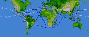 Mexican silver and Spanish goods are shipped to Manila to buy Chinese porcelain, silk, jade, silk; Indian cotton and rugs; and Spice Island and Malaysian spices for the return to Acapulco.